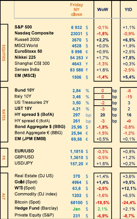 - Wild markets once again last week, starting with Equities hit by rotation when Value stocks are outperforming Growth stocks (sectors in favour include Hardware while Software are hit hard by the surge in Capex from AI related stocks). The DJ hit a 50000 ATH