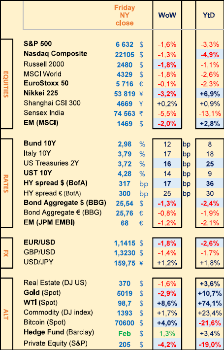 Last week: 2 weeks war with Iran (inflation fears, growth reduction) lower stock indices, higher yields/credit margins