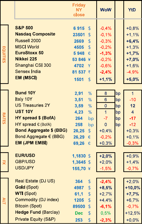 - Wild markets last week, after Trump’s renewed threats of tariffs towards the EU but finally dropped those mid way on Thursday (typical TACO trade: Trump Always Chickens Out, hence fairly stable US Treasuries in the end) having said that the USD finished the week a lot weaker (-2%) and Precious Metals hit new ATH (Gold +10% YTD, Silver +40%)