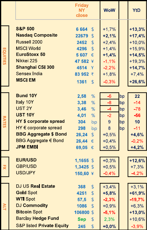 Last week: US-China trade talks, ceasefire in ME, US-RU talks; Q3 earnings, France’s debt downgrade, US regional banks