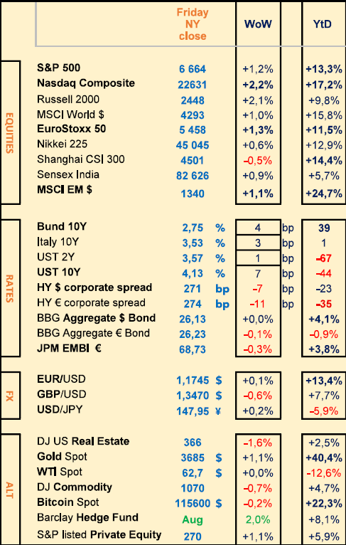 - The FOMC/FED did cut rates as expected by -25bps (4-4.25%), with most likely 2 more cuts this year (J. Powell pivoting towards a job market focus). The MPC/BOE kept its base rate unchanged at 4% (UK CPI for August came out as expected at 2.9% p.a.). The BOJ kept also its rate unchanged at 0.5% after PM Ishiba’s resignation and among the new political uncertainty