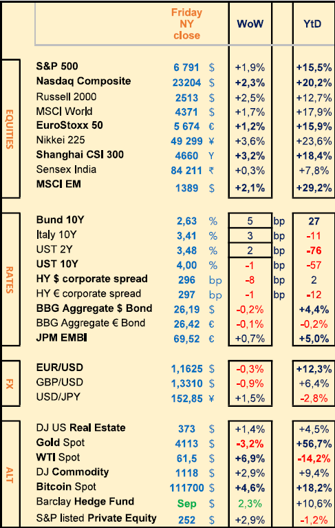Our view on the new wave of trade tensions between the US and China remains fundamentally unchanged. The current political manoeuvring follows a familiar script. Both Washington and Beijing have a clear interest in reaching an agreement by the end of the month. Admittedly, although the trade conflict has eased after some immediate retaliation following Liberation Day, the underlying strategic rivalry between the two countries has never disappeared. In other words, the risk of increased market volatility caused by a new flare-up of trade tensions is likely to remain present for the foreseeable future, but a permanent and disruptive trade war still seems unlikely. Furthermore, Chinese exports have held up surprisingly well despite a drop in shipments to the United States. In fact, these losses have been more than offset by increased shipments to other destinations, putting the United States in a relatively weakened negotiating position. As far as risky assets are concerned, we may have entered a consolidation phase that is likely to last for some time, heavily dependent on the degree of escalation of tensions between the two sides ahead of their meeting at the end of the month at the Asia-Pacific Economic Cooperation summit in South Korea.