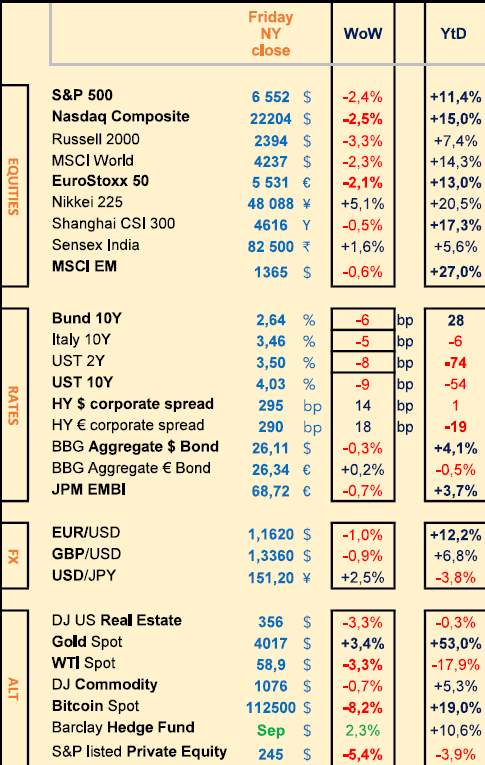 - Meanwhile, we shall have the first releases of 3rd quarter corporate earnings next week with US banks : JPM, Wells Fargo, BlackRock, Citigroup and GS on Tuesday, followed by BofA and MS on Wednesday, and StateStreet on Friday. Together with other names : LVMH, BP, Vinci, Rio Tinto, Nestlé, ABB, Essilor Luxottica.