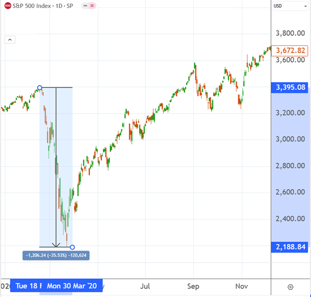 Что произошло: с 24 по 28 февраля 2020 года ведущие биржевые индексы вдруг упали сразу на 10% за шесть торговых дней – это самая быстрая коррекция с начала торговых хроник. Вскоре, к 23 марта 2020 года, S&P 500 рухнул на 34% от февральского пика. Мировые компании снимали дивиденды, золотые запасы росли, а нефтяные фьючерсы даже упали в отрицательную зону. Однако уже к лету 2020 года рынок резко восстановился: благодаря массе мер поддержки и позитивным новостям об эффективном лечении инвесторы быстро забыли о панике.
